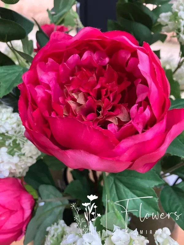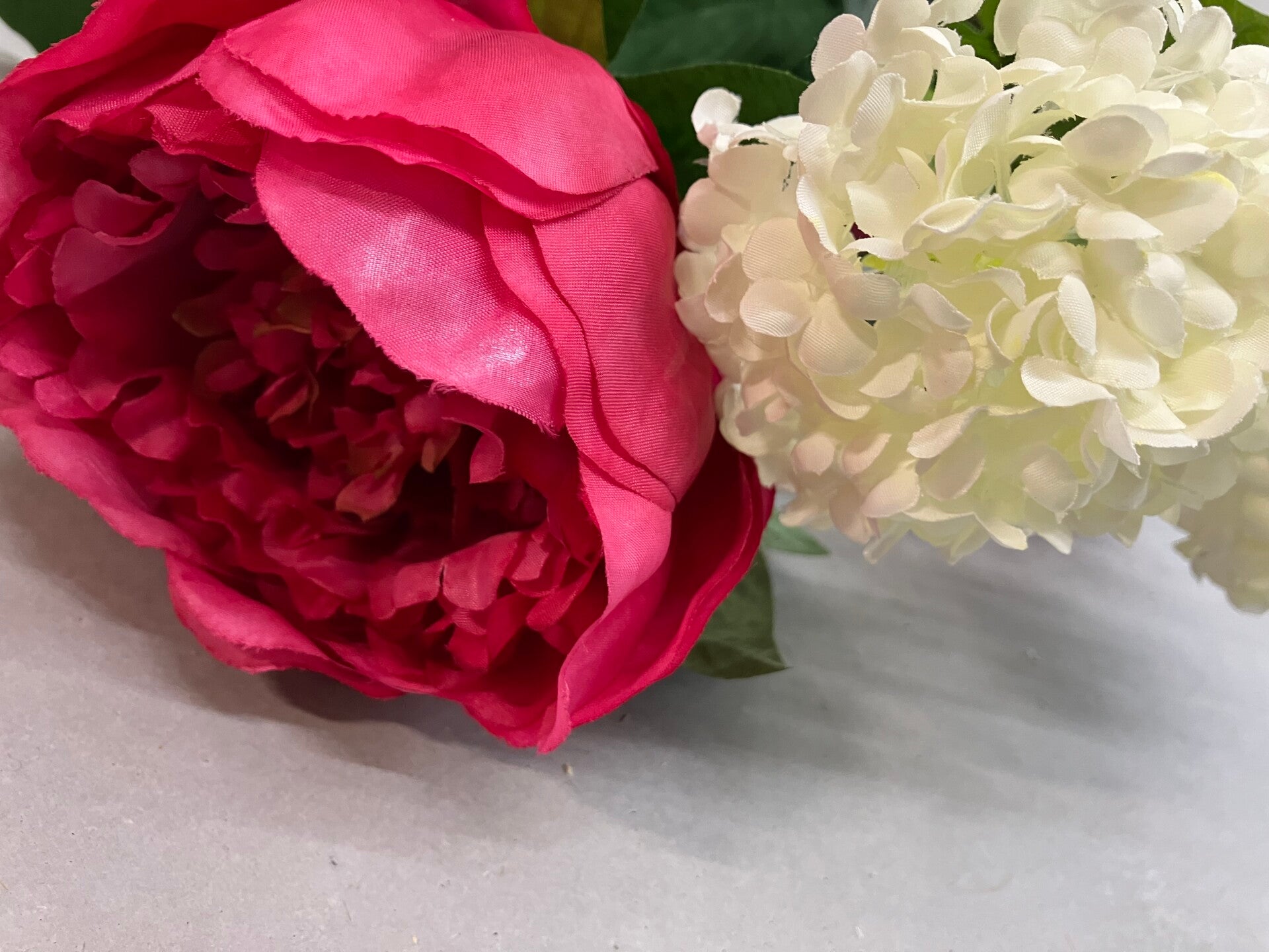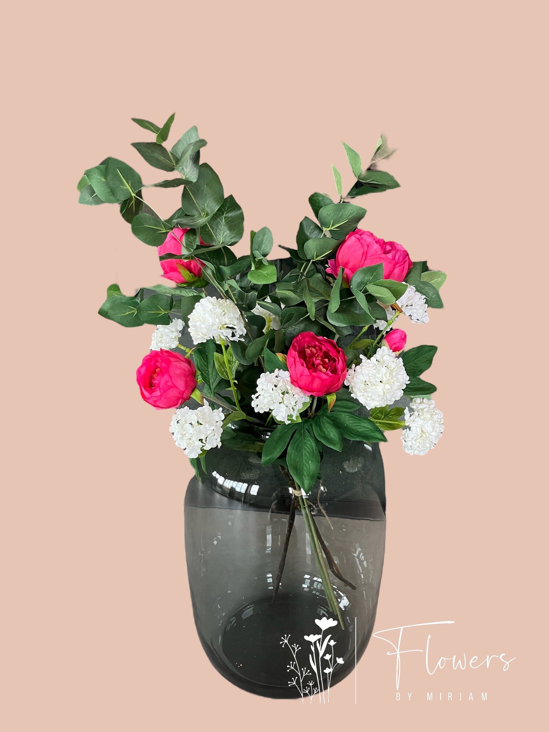 Zijden boeket met kleurrijke tint. De fuchsia kleurige pioenrozen vormen een mooi contrast bij de witte viburnum en maken het geheel tot een rustig boeket!