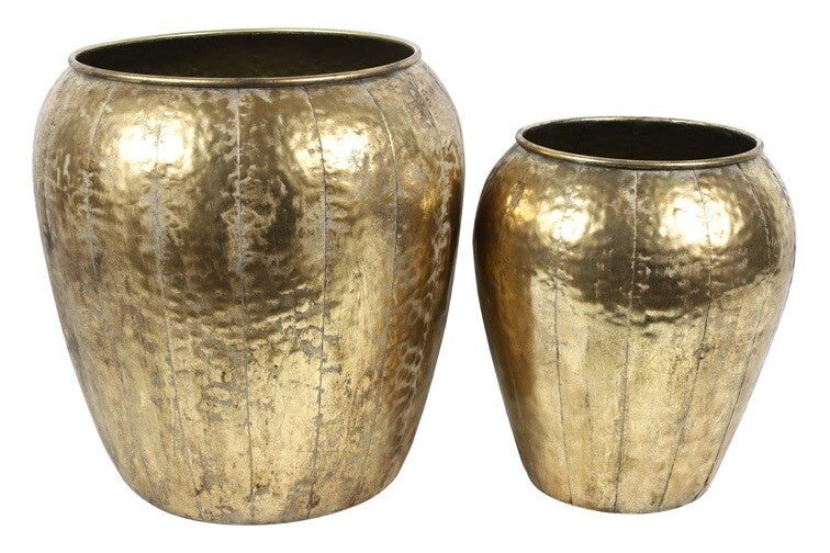 Verrijk je interieur met deze metalen gouden set van vazen met opvallend design. Deze vaas is de ideale showcase voor je bloemen en kunstplant. Laat je creativiteit bloeien en creëer unieke arrangementen die je interieur verfraaien. Voeg een vleugje natuurlijke verfijning toe aan je wooncollectie met onze tijdloze vaas!