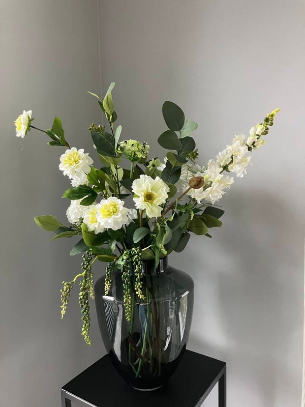 Een rustig boeket vol met witte bloemen, waaronder de gerbera, leeuwenbek, nigella, viburnum, eucalyptus, papaver en arabicum.