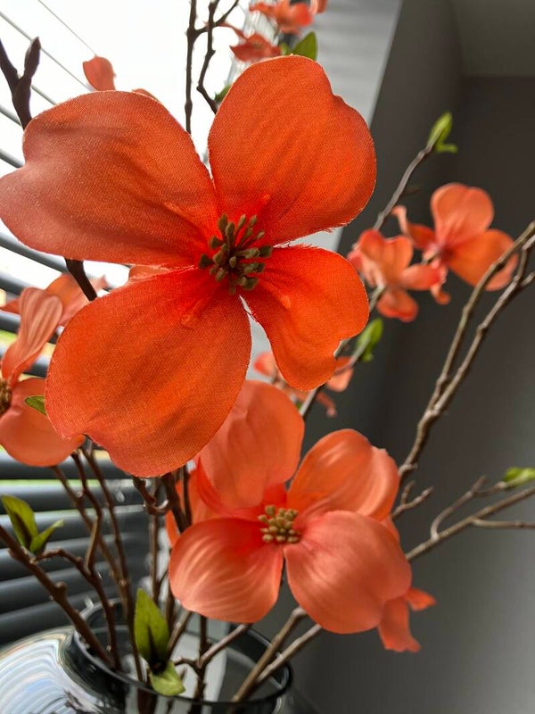 Wat een prachtige grote tak met speelse perzikkleurige bloemetjes. Deze geven een luchtige sfeer in je vaas.