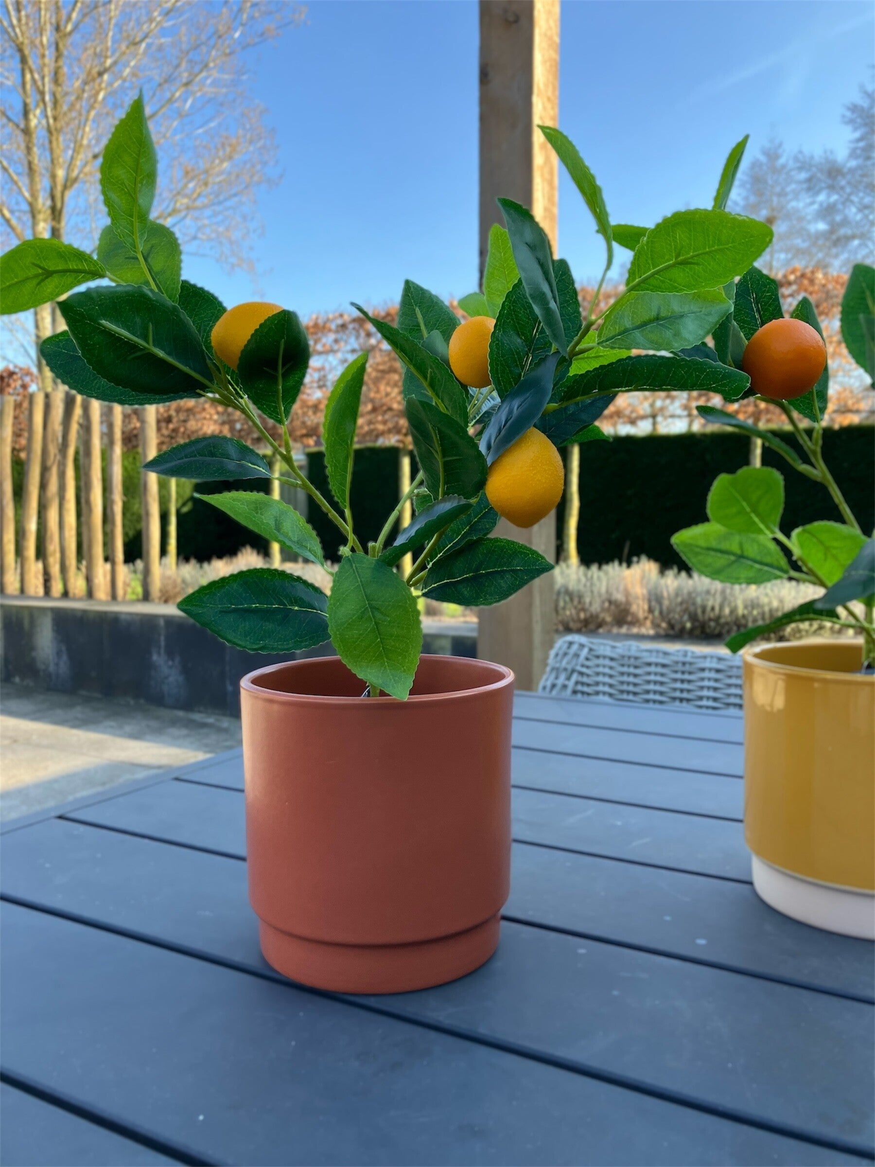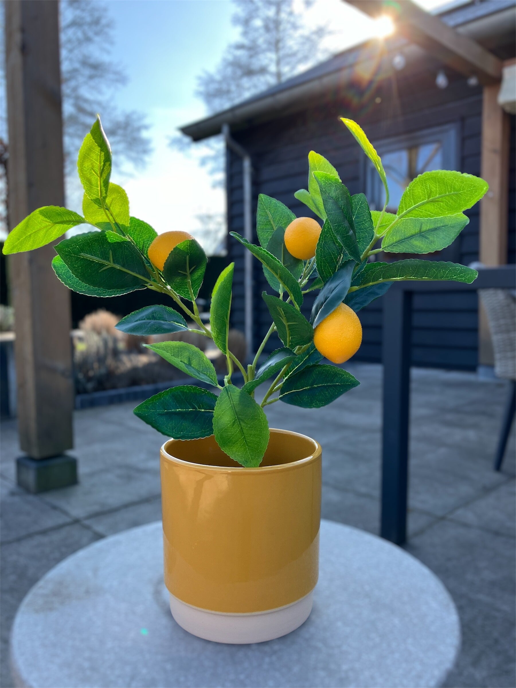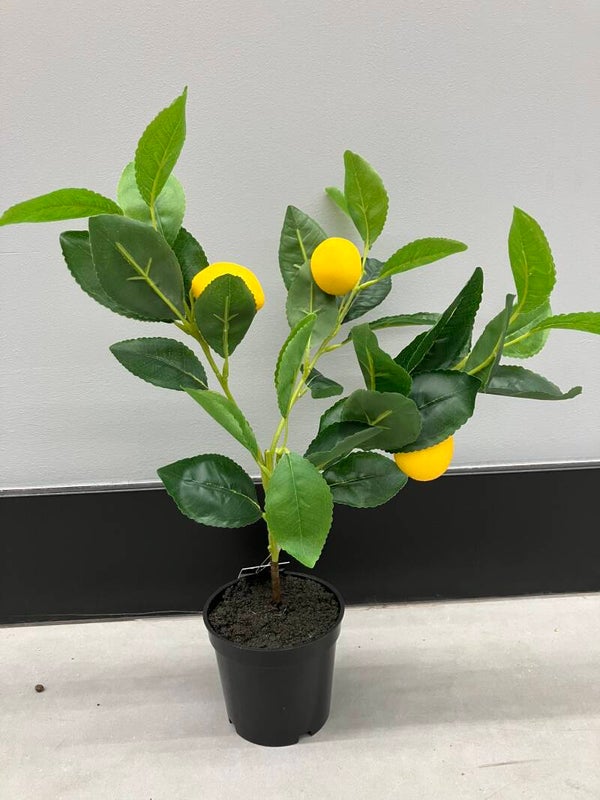 Hoe leuk is deze kleine zijden citroenplant met citroentjes eraan. Leuk in je keuken of buiten op de tuintafel.