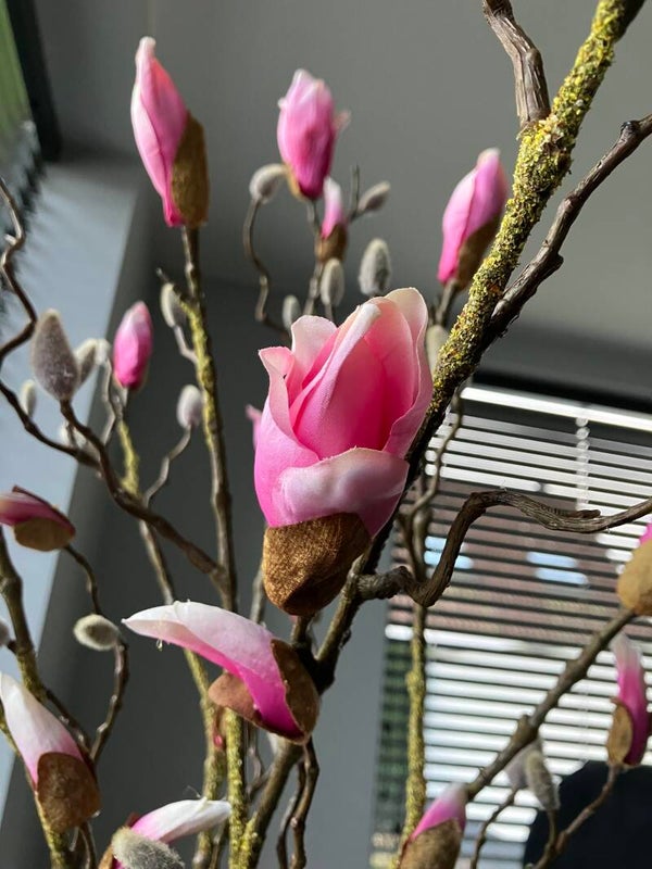Roze magnoliatak met knop en bloemen in knop! Zo is de tak toch op z'n mooist? Met het grote voordeel dat de blaadjes van de magnolia er niet afvallen en je er maanden lang plezier van hebt!