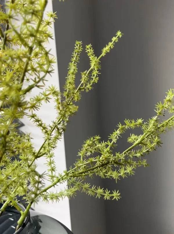 Mooi boeket van 2 grote asparagustakken en 3 donker rode rozenbotteltakken.