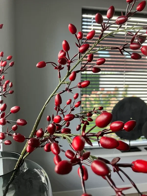 Een rustig najaarsboeket van 3 eucalyptus takken en 3 rode rozenbotteltakken.