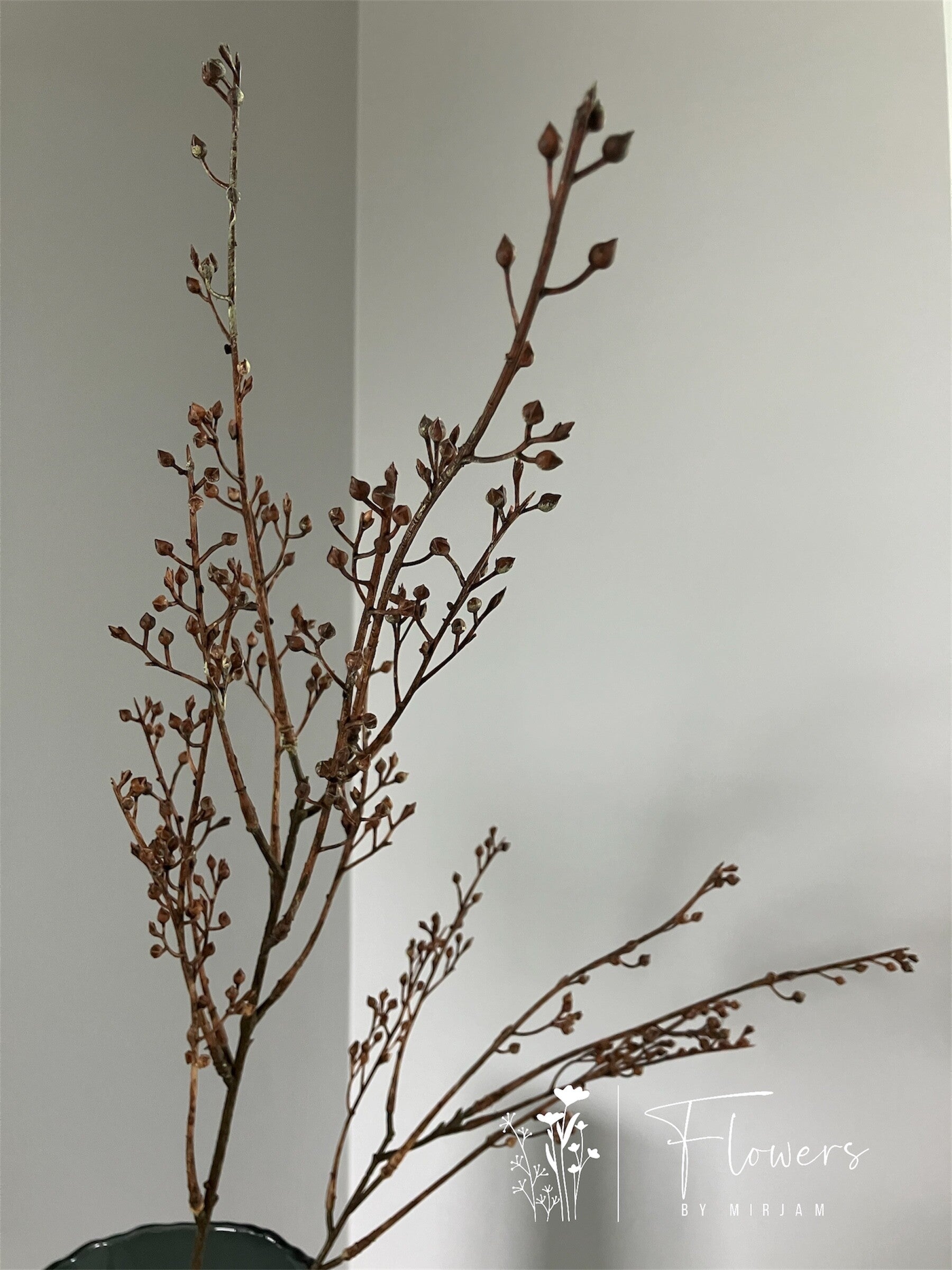 Prachtig boeket met groen, bruin en beige tinten. In het boeket vond je groene besjes, olijf, eucalyptus Bells, lampepoetsergras, bloesem, bruine besjes en papaver