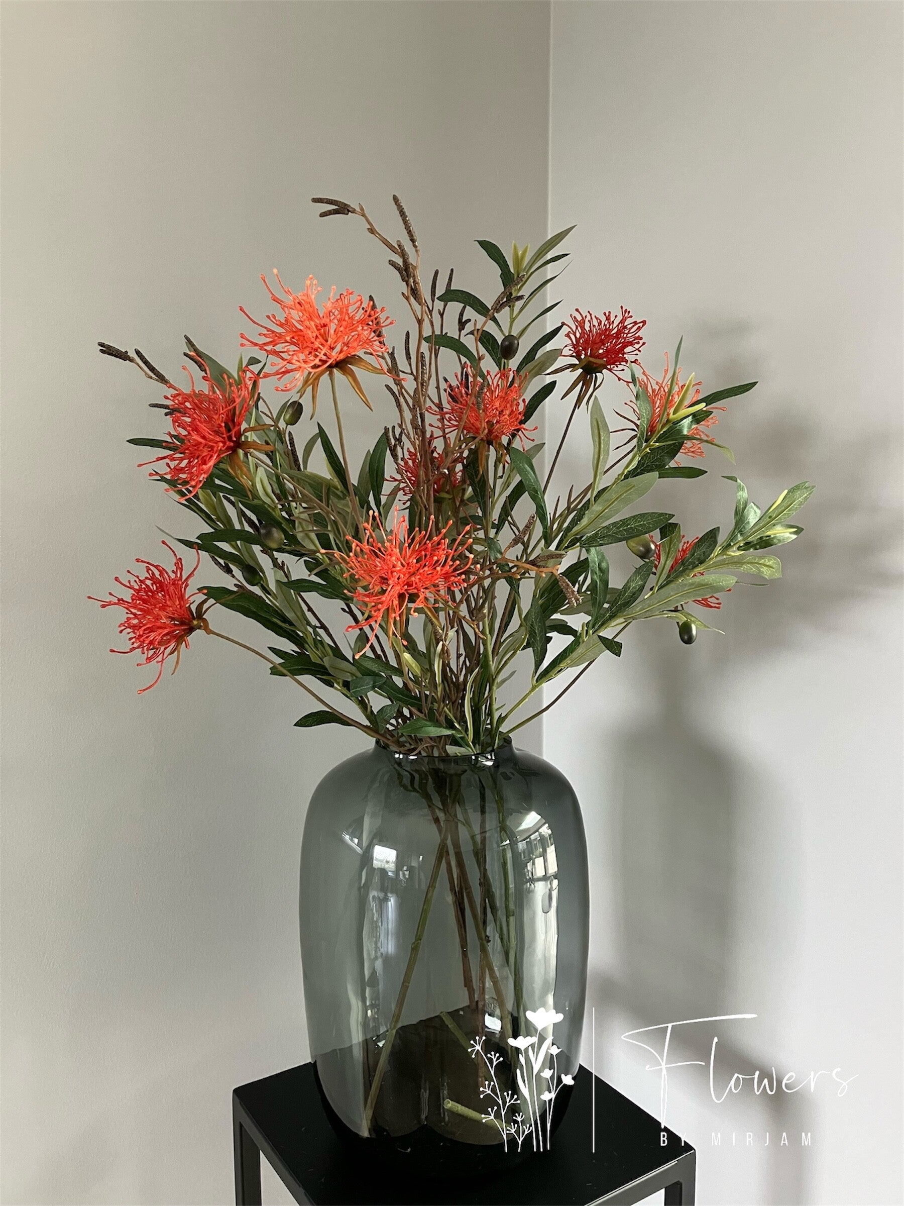 Prachtig rustig boeket met 2 olijftakken, 3 berkentakken en 2 oranje Hakea takken.