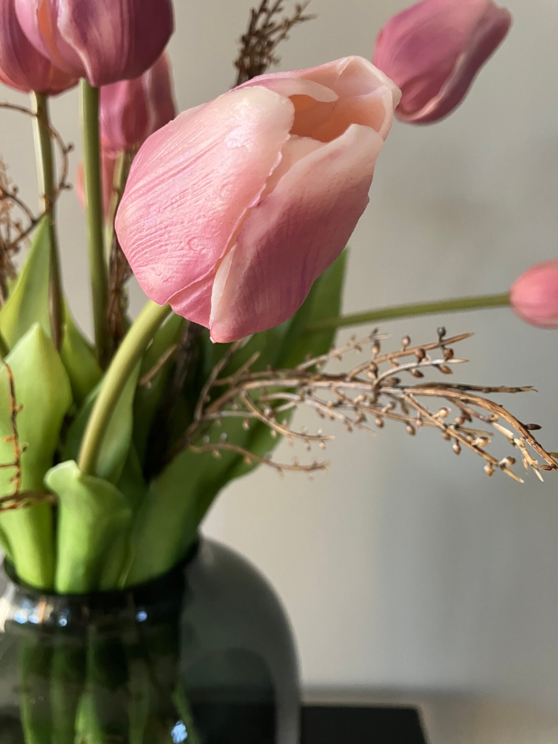 In dit mooie tulpenboeket vind je 2 bossen real touch kunsttulpen van 47cm en 3 kunst gageltakjes.