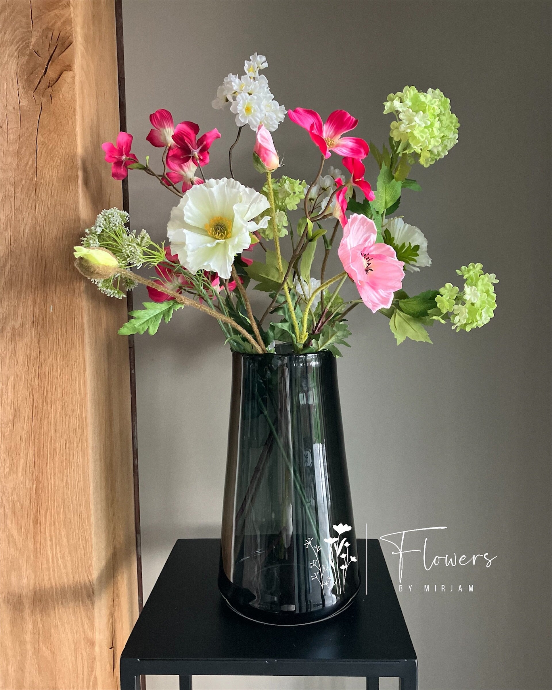 Dit vrolijke voorjaar/zomerboeket heeft 8 stelen met mooie roze/wit/groene tinten. Door de takken los in de vaas te zetten creëer je een luchtige sfeer.